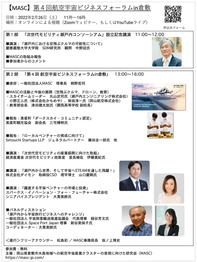 岡山県倉敷市水島地域への航空宇宙産業クラスターの実現に向けた研究会(MASC)は、2022年2月26日(土)に、「第4回 航空宇宙ビジネスフォーラムin倉敷」を行います。