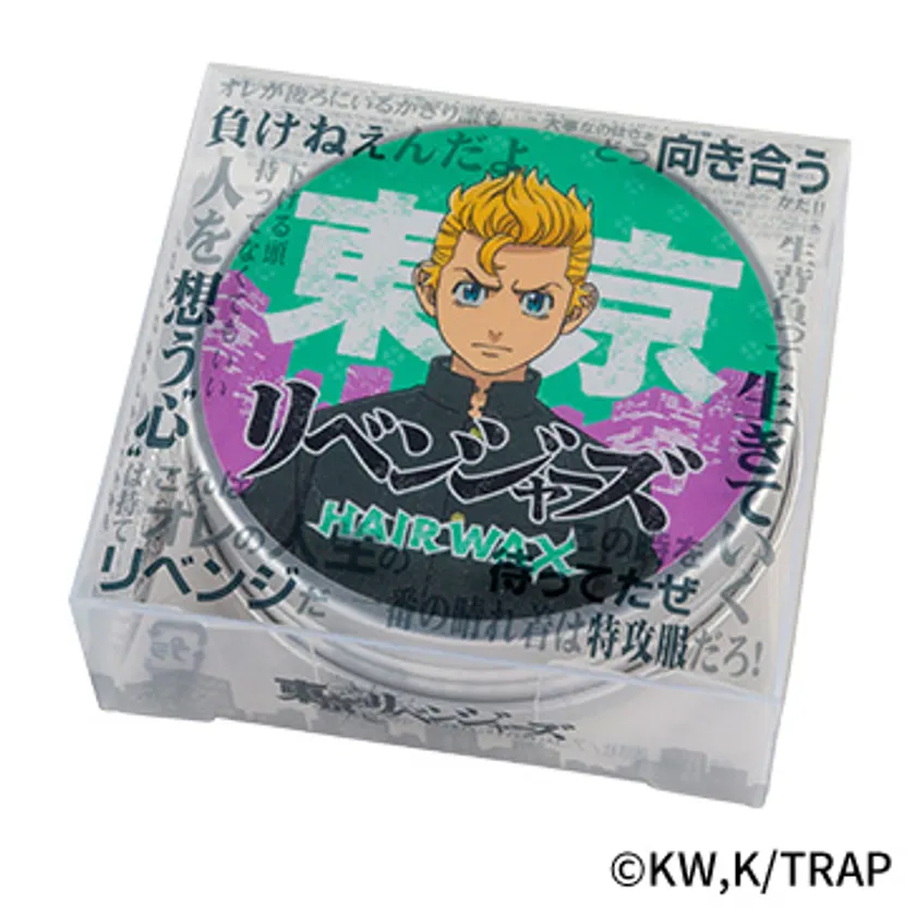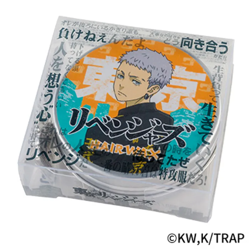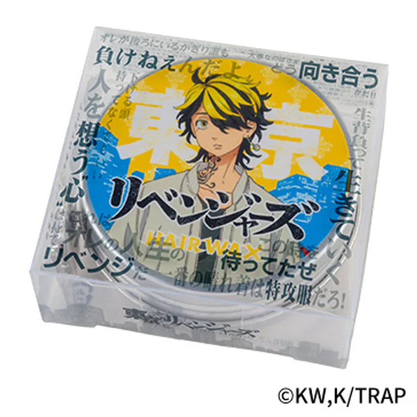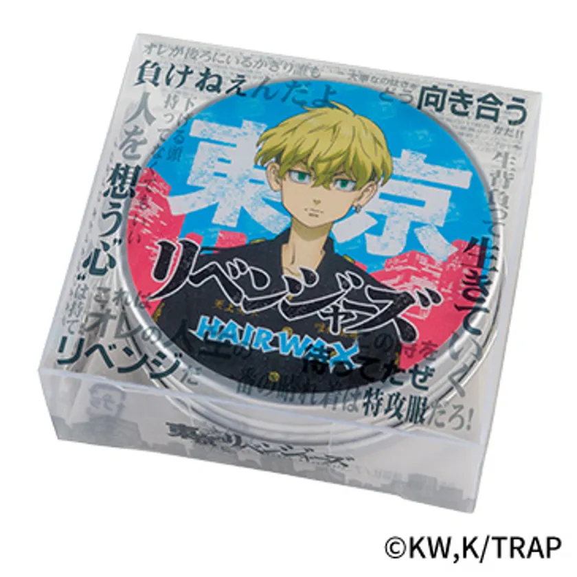 TVアニメ『東京リベンジャーズ』に登場するキャラクターと、作中の数々の名言がパッケージにデザインされたヘアワックスです。