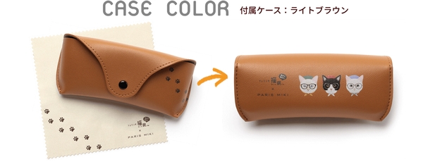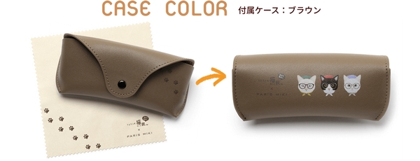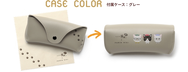 専用ケースとメガネ拭きを付属しており、ケース背面には猫のイラストと足跡をプリントしています。