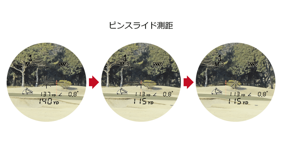 ピンシーク機能※では、「ピンダイレクト測距」と「ピンスライド測距」の2つの測定方法を搭載。「ピンダイレクト測距」では、ピンの方向へ向かって長押しすることで、自動でピンを探し出し、距離を測定します。さらにピンが遠くにあり、手ブレで捉えることが難しいときには、もう1つの測定方法である「ピンスライド測距」が便利です。スイッチを長押ししながらピンの周辺をスライドすることで、ピンまでの距離を測定します。ピンを見つけた時点でブルっと振動するため、スピーディにストレスなく測定できます。