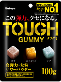 ・『タフグミ』シリーズ同様に、クセになる高弾力、食べ応えのある大粒、刺激的なサワーパウダーに加え、どこから噛んでも同じ弾力が感じられるキューブ型が特長