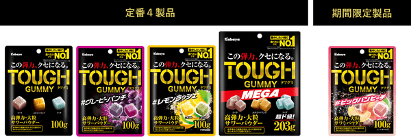 『タフグミ』ブランドは、最大の特長である噛み応えある独自の高弾力食感とサワーパウダーによる刺激性が引き出す“やみつきになる美味しさ”が支持され、累計販売個数は1億個を突破、主力製品の『タフグミ』は2024年度グミ市場販売金額No.1※1になるなど、成長著しいグミ市場において確固たるポジションを築いてきました。