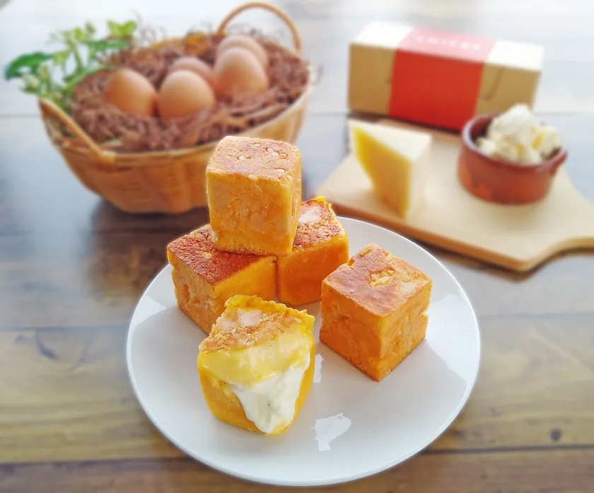 今回発売するCHiCRE(チクレ)は株式会社ジビショウとしての集大成のような商品です。生地はもちろんのこと、使用するクリームも全てこだわりが詰まっています。四角く可愛らしい見た目のチクレですが、実は焼きあげるのが難しい形です。そこで生地の配合から試行錯誤を繰り返し、CHiCRE(チクレ)のために特別に配合した当店のオリジナル生地が出来上がりました。食パンを作ってきたふろまーじゅだからこそ作れる生地になったと感じています。そして焼き上げる際には、上部に薄いクッキー生地と砕いたアーモンド、パールシュガーをちりばめることによって食感と味に良いアクセントとなっています。中に入っているクリームは2種類使用しており、1つは自家製カスタードクリームです。農林水産大臣賞を受賞した濃厚な玉子「ぷりんセスエッグ」を使用し店内で1から職人が手作りすることにより、CHiCRE(チクレ)に最も合った味に仕上げることができました。もう1つのクリームはたっぷりのチーズ感を味わえる生クリームです。使用するチーズは酪農王国デンマークのプレミアムチーズ「BUKO」でミルク感たっぷりです。生クリームはご注文いただいてから入れることで、新鮮なクリームを出来立ての状態でお召し上がりいただける商品になっています。このような2種類のこだわりのクリームをたっぷり使用することでプレミアムな商品になりました。