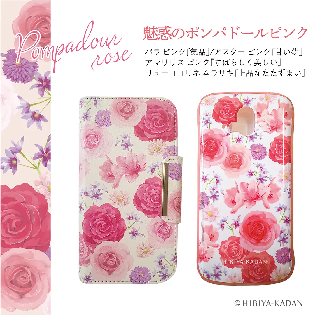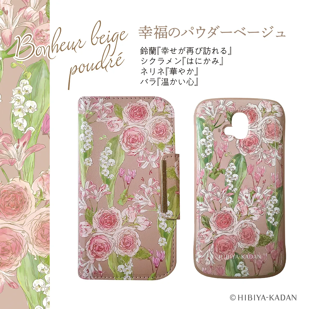 2020年12月に発売された第1弾、2021年12月に発売された第2弾に続き、第3弾となる今回のスマートフォン専用カバー向けの花柄は、「いつも手に花束を」をテーマに、全体に花をちりばめ、高級感と洗練された華やかさを表現しています。イラストは日比谷花壇のフローリストがデザインコンセプトからイラスト制作まで仕立て、デザインの組み上げも日比谷花壇のグラフィックデザイナーが担当。花屋だからこそ表現できるリアルな花の生命感で、スマートフォンを手に取るたびに華やぐ気分を楽しんでいただけます。今回はそれぞれイメージに合う花言葉を持つ花をセレクトした、華やかさや気品、魅力のある花柄となっております。大切なお母さんへ贈る、5月8日(日)の母の日に向けたプレゼントにもぴったりな商品です。