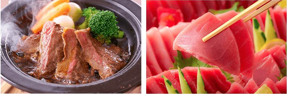 左:サーロインステーキはお客様自身で、陶板で好みの焼き加減に焼き上げてお楽しみください。熱伝導率の良い陶板で焼くため肉の旨味が逃げず、冷めづらいのも美味しく召し上がれるポイントです。