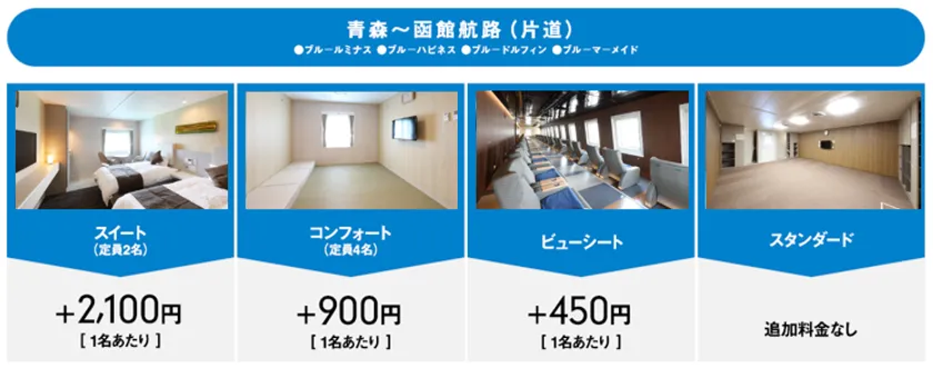 「気軽に徒歩で北海道・東北へ!」。気軽にふらっと海を渡ってみようと思える価格帯を目指しました。差額プラスで個室や指定席へのアップグレードも可能です。インターネット予約のお客様はスマートチェックイン(自動発券機)での発券ができますので、カウンターへお立ち寄りいただくことなく乗船することができます。