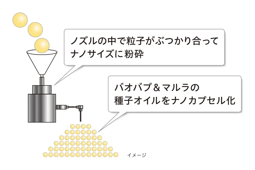 独自のテクノロジーでオイルを微細化する製法。特殊装置のノズルの中で粒子がぶつかり合ってナノサイズに粉砕されます。オイルクラッシュハイドレーターでは「バオバブオイル」「マルラオイル」をナノカプセル化して配合しました。