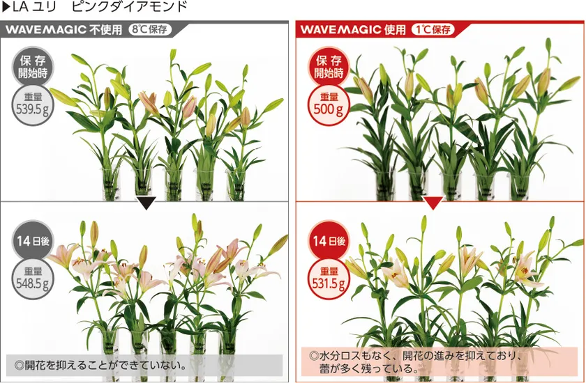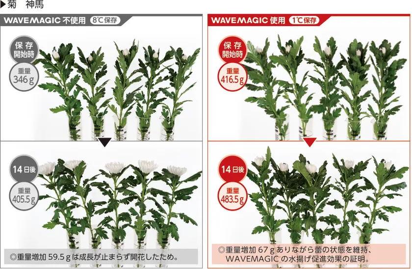 品種改良や新製品の開発には長い年月と莫大な費用が必要で、しかもそれが成功する保証はありません。「WAVEMAGIC」は、導入と同時に、鮮度やおいしさという差別化によるブランド化が可能になります。生花では鑑賞期間が長くなるという大きな訴求ポイントが生まれます。
