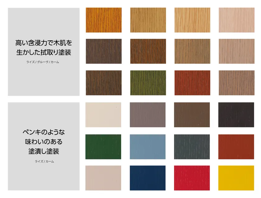 当社では、30年以上前から自然素材の建築資材の販売に取り組んできました。天然素材の表情を引き出す塗装サービスにも力を入れており、現在では年間で1万本近くの塗装ドアを販売しております。塗装の魅力は、同じ素材・同じ色でも、表情の違いや個性が生まれること。これまで培ってきた木と塗装のノウハウを活かし、玄関ドアの魅力を最大限表現する塗装サービスをご提供いたします。