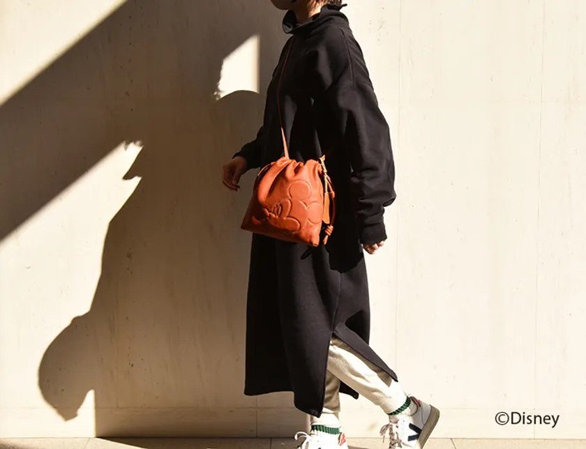 ■ソフトで上質な牛革に、ちょっととぼけた表情が可愛らしいミッキーマウスの刺繍を施したミニポシェット。ワンマイル、ハンズフリーに!