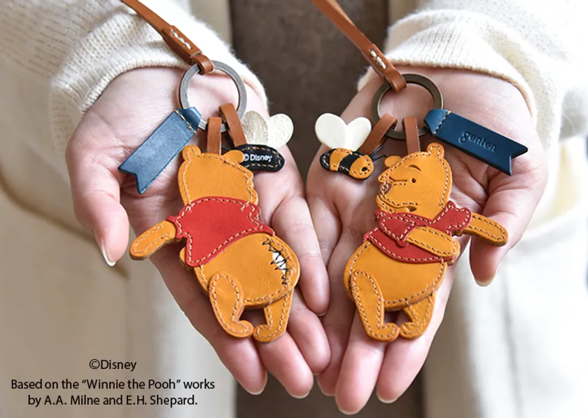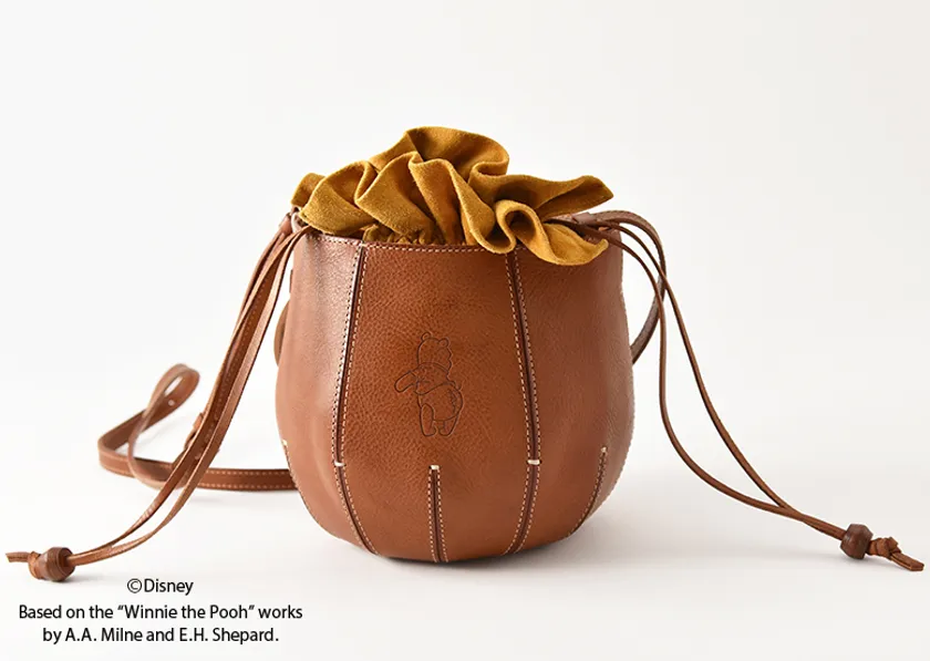 本体のコロンとしたフォルムに内装のはちみつ色の巾着を少し垂らせば、プーさんの世界観が広がります。巾着の先端には、革を何層も積層し職人が丹念にコバを磨いて作った、ハニーディッパー風の飾りなど、細部のこだわりもお楽しみいただければと存じます。