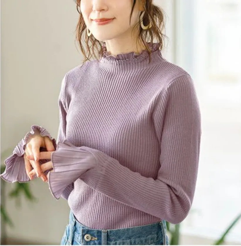 長めのフレアプリーツデザインの袖口が大人可愛いリブニット素材のトップス。柔らかく着心地の良い生地は伸縮性があり、程よく体のラインにフィットします。S~5Lまでの幅広いサイズ展開は、ジャストサイズでキレイめコーデや重ね着スタイルでも、或いはいつもよりオーバーサイズでカジュアルに着こなしても、それぞれ異なる表情を楽しめそうです。衿は、ハイネックの他にVネックとクルーネックタイプがあり、豊富なカラー展開と共にその日の気分やコーデに合わせて選ぶ楽しさも。