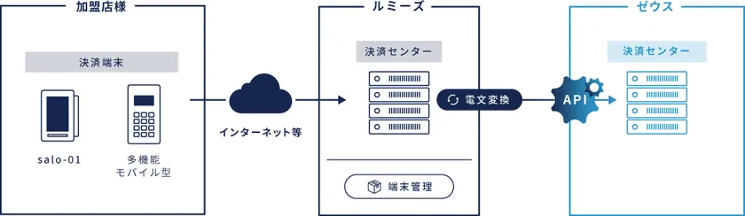ルミーズ株式会社(本社:長野県小諸市、代表取締役:戸田 一行、以下「ルミーズ」)は、このたび株式会社ゼウス(本社:東京都渋谷区、代表取締役:金子 雄一、以下「ゼウス」)が提供する対面決済ソリューションとの連携を開始しました。連携にあたり、ルミーズ決済センターとゼウス決済センター間で接続を開始し、ゼウスは新たな対面決済ソリューションとして、ルミーズが展開する組込型マルチ決済端末「salo-01」を活用したマルチ決済ソリューションを提供し、実店舗における決済手段の拡充を図ります。