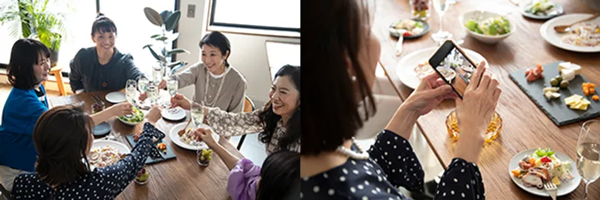子育てを終えて旧友や同僚が集まる機会が増えた女性たちをテーマに、フードやドリンクを楽しみながら贅沢な時間を過ごすパーティーシーンを表現しました。