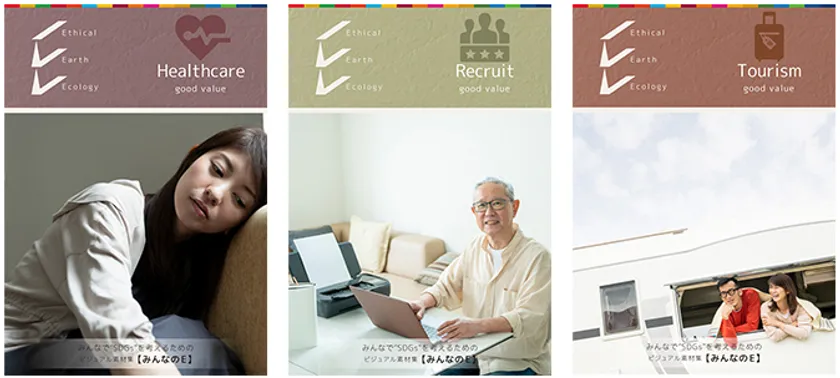 『みんなのE』は、イメージナビがお届けするみんなでSDGsを考えるためのビジュアル素材集です。本タイトルは「働きがいも 経済成長も」を推進している企業様に向けて「農業」「教育」「林業」「健康」「人材」「観光」の6つのタイトルをご用意しました。