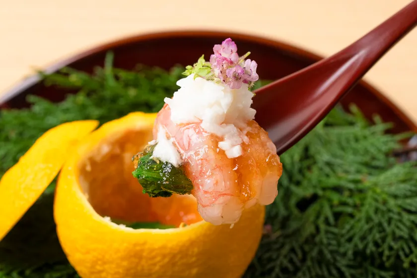 ・柚子釜 甘海老 壬生菜 長芋 ジュレ掛け