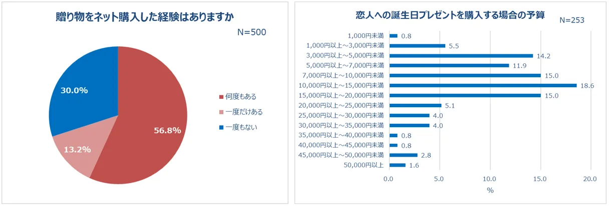 7割が贈り物のネット購入経験あり。 贈り物選びの悩み「欲しいものが分からない」「時間がかかる」 贈り物をする機会は「誕生日」が最多。 予算は友人・両親より恋人に贈る場合の方が高い傾向! 9割以上が贈り物をもらうと「嬉しい」