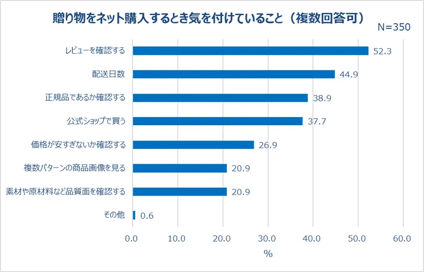 しかし、ネット購入は現物を手に取って選ぶことができないなど、店頭での購入とは異なる特徴もあります。そこで経験者に、贈り物をネット購入するときに気を付けていることを聞きました。その結果「レビューを確認する(52.3%)」といったネット購入ならではの機能を活用している人や、「配送日数(44.9%)」に気を付けている人が多いことが分かりました。「正規品であるか確認する(38.9%)」「公式ショップで買う(37.7%)」など、信頼できる販売元であるかを確認するという意見もありました。