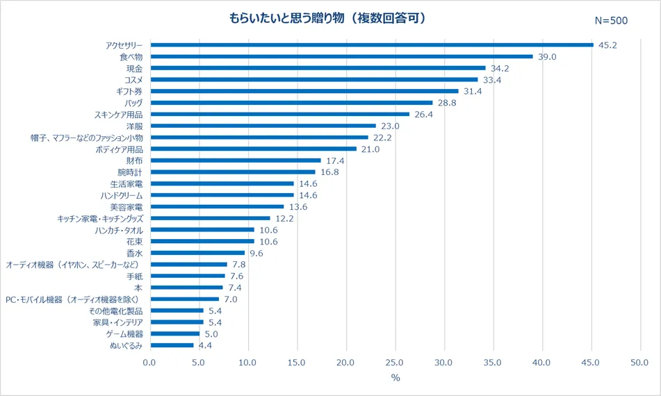 最後に、どんな贈り物をもらいたいかについて調査。「アクセサリー(45.2%)」「食べ物(39.0%)」「コスメ(33.4%)」が上位にランクインする中、「現金(34.2%)」「ギフト券(31.4%)」と回答した人も多く、20代~30代女性の本音が垣間見える、リアルな調査結果となりました。