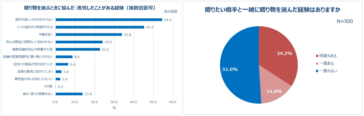 続いて、贈り物を選ぶときに悩んだり、苦労したりした経験について聞きました。その結果、何を贈るか・かかる時間・予算など、贈り物を選ぶにあたっては幅広い悩みが生まれることが分かりました。中でも、半数以上の人が「相手の欲しいものがわからない(54.4%)」と悩んでいることが明らかに。そこで、贈りたい相手と一緒に贈り物を選んだ経験があるか聞いたところ、半数近くの人が「ある」と回答。欲しいものを相手に直接聞くことで、確実に喜んでもらえるものを贈っている人も多いと考えられます。