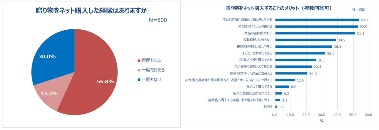 3.7割が贈り物をネット購入した経験がある。メリットは「効率的」「じっくり選べる」「商品の選択肢が多い」