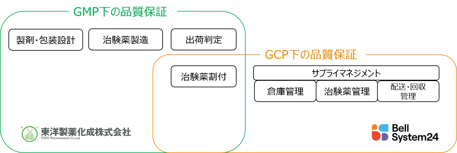そこで今回、1,000の試験を超える抱負な治験薬割付業務での実績や、盲検化及び無作為化の幅広い知見を持つベルシステム24と、100年を超える歴史の中で蓄積した経験および最新テクノロジーを備え、PIC/S*1に準拠した「薬品等の製造管理および品質管理に関する基準(以下:GMP)*4」下での治験薬を含む医薬品製造受託機関である東洋製薬化成がパートナーシップを組むことにより、お互いの強みを組み合わせた、治験薬のサプライチェーンマネジメント全体を管理するサービスの提供を開始します。