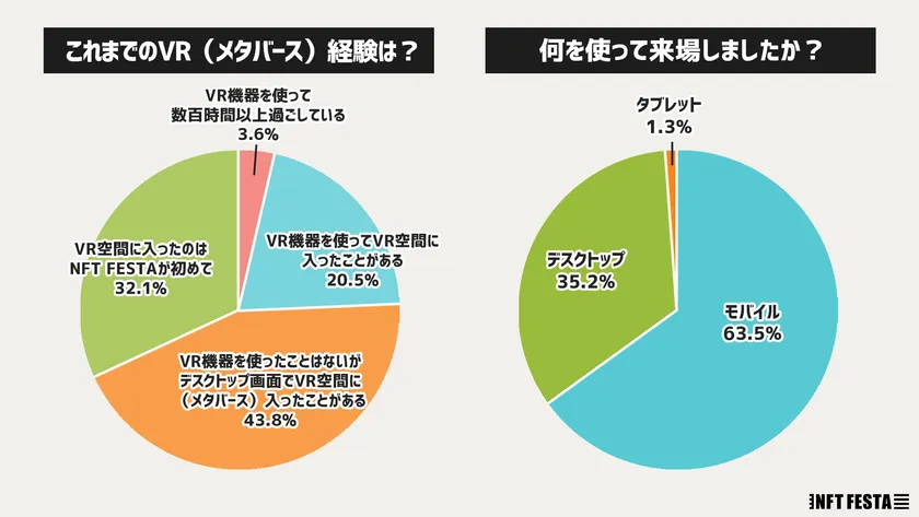 アンケート結果から、今回の「NFT FESTA」は30代~40代の方に多くご来場いただき、約50%の方が「NFTを買ったことがある」ということがわかりました。一方、NFTの購入経験がない方も約30%となっており、NFTに興味を持ち始めたばかりの方にもお越しいただいたことが分かります。女性比率は従来のバーチャルイベントと比べて高めで、VR空間が初めての方も約32%いらっしゃいました。