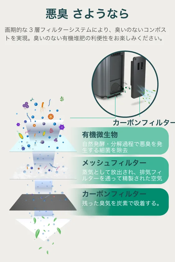 リーンクル独自の有機微生物が悪臭の原因となるバクテリアを分解します。リーンクルのバイオソイルは常時45度~55度で微生物が分解を行っており、悪臭の原因となる微生物はそもそもこの環境では生きられないため、ニオイを防いでくれます。