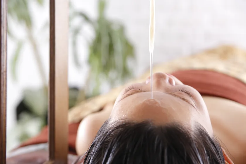 アーユルヴェーダという言葉は聞いたことがあっても、「シロダーラ」はご存知ない方が多いのではないでしょうか。シロダーラはアーユルヴェーダの施術のうちのひとつで、頭部滴油療法ともいい、オイルを垂らすことで、額にある「第3の目」ともいわれる脳のツボを刺激します。ここを刺激すると「瞑想の脳波」であるシータ派が発生し、脳を深いリラックス状態に導きます。脳が上手に休むことで、身体のバランスが整い、免疫力もアップ。心身の不安やストレスを開放するという医学的エビデンスもでています。