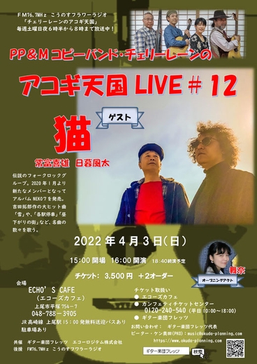 ギター楽団フレッツ『大塚まさじ sing Folk Song チェリーレーンのアコギ天国LIVE#13』が2022年5月8日 (日)に、『猫 sing Folk Song チェリーレーンのアコギ天国LIVE#12』が2022年4月3日 (日)に、エコーズカフェ(埼玉県上尾市)にて開催されます。チケットはカンフェティ(運営:ロングランプランニング株式会社、東京都新宿区、代表取締役:榑松 大剛)にて発売中です。