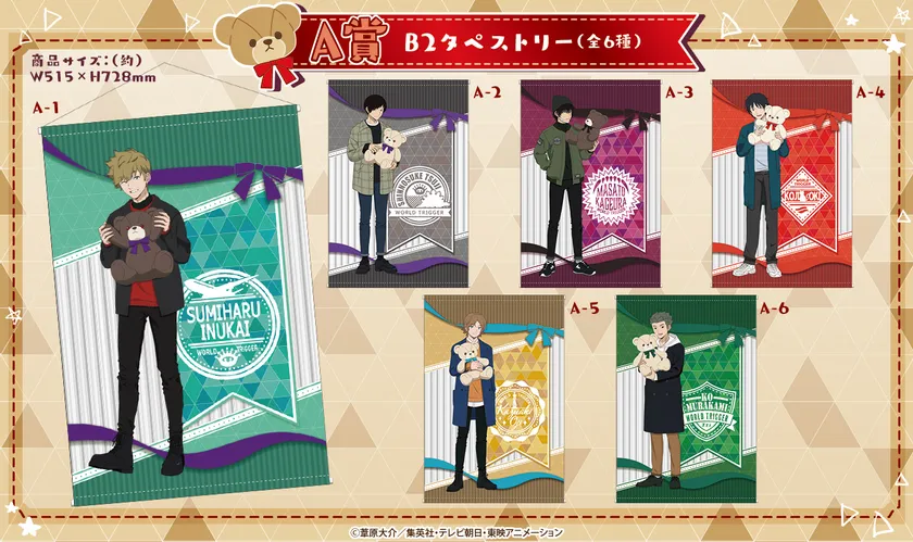 おしゃれな私服を着たキャラクターたちがプレゼントのテディベアを持っている描き下ろしイラスト。また各賞に描き下ろしに加えオリジナルのモチーフを使った豪華仕様です。