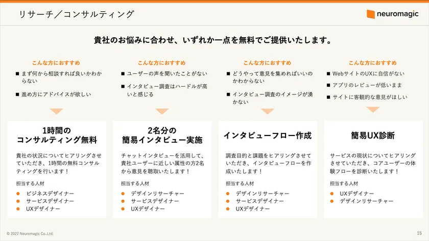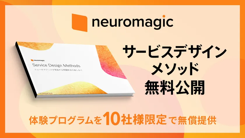 デザインの力で課題を解決する、株式会社ニューロマジック(本社:東京都中央区、代表取締役社長:黒井 基晴)は、3月1日から3月31日までの期間限定で、通常10~30万円相当の「簡易リサーチ」「デザインコンサルティング」「UX診断」等のプログラムを10社限定、無償で提供いたします。またホームページ上ではご希望の方全員に問題解決プロセスをまとめた「サービスデザインメソッド集」を無料で進呈。実践・事例が豊富な当社ならではの、すぐにビジネスに活用できるメソッド集です。