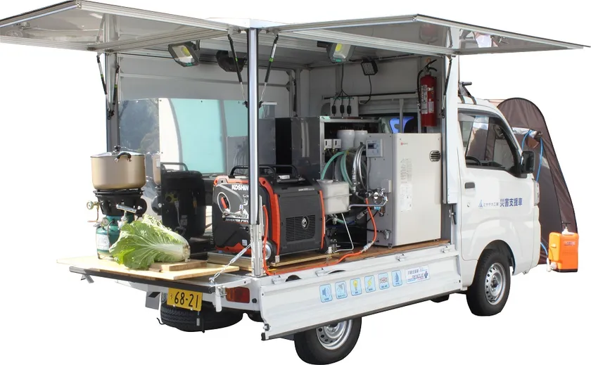 飲料水の他給湯器とシャワー装備で身体も洗えます。発電機は安定した電気を供給し情報通信機器などにも接続が可能。調理器は多人数用大鍋で調理できるコンロを装備し夜間にも対応できる照明を装備しました。軽トラックで狭い道にも強く、抜群の機動力できめ細かな支援が可能です。