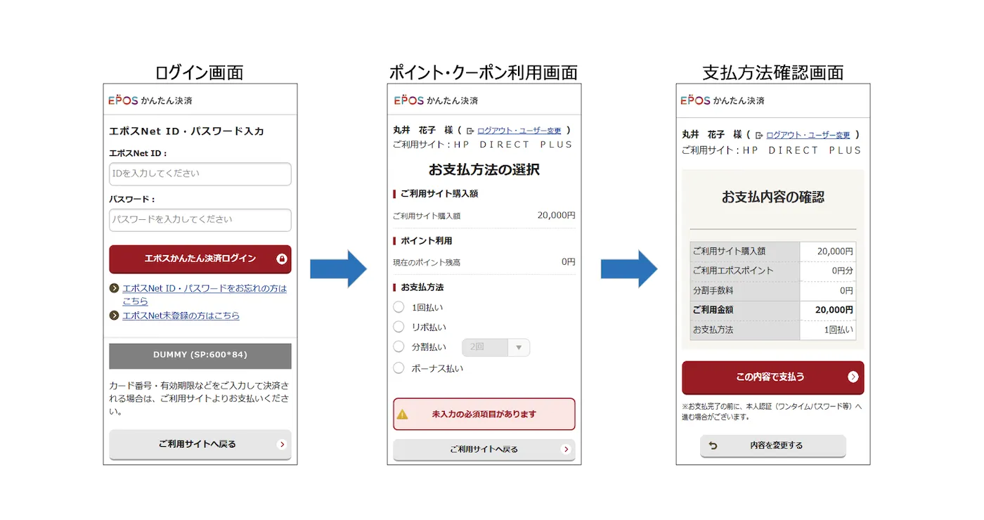 「エポスかんたん決済」は、株式会社エポスカードが提供する決済サービスです。決済画面でエポスカード会員がお持ちのエポスNet ID・パスワードを入力してログインすることで、クレジットカード番号の入力が必要なく、エポスNet IDに紐づくエポスカードでのお支払いが可能です。決済金額に応じてエポスポイントが付与され、保有するエポスポイントやクーポンを決済時に利用できます。