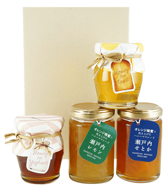 100種類以上の蜂蜜の中から味わいの違いにより用途別に食べ方を提案する用途別蜂蜜と、瀬戸内産レモンやせとかをオレンジ蜂蜜で炊き上げたママレードのギフトセット。
