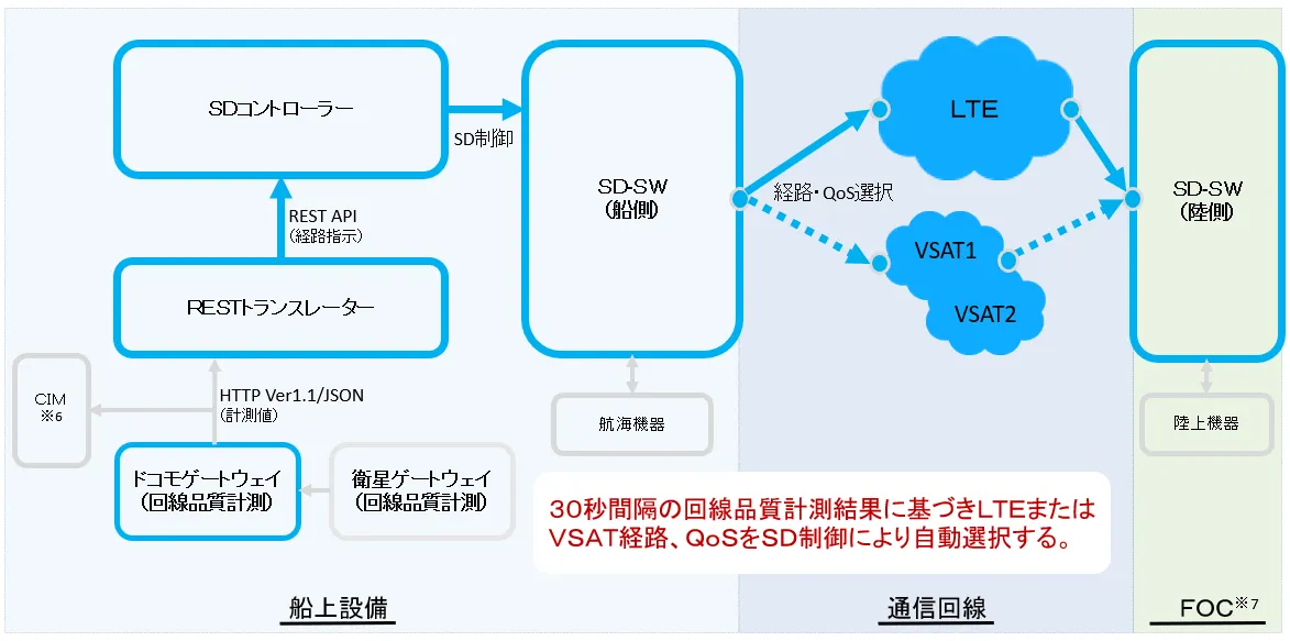 衛星とモバイル通信に対応したSDN技術(※5)を用いた通信システムを船舶と陸上に配置し、通信経路を衛星とモバイルのハイブリット化することで、船上設備が通信経路を意識することなく、通信状況に応じて最適な経路を自動選択可能な仕組みを実装しました。