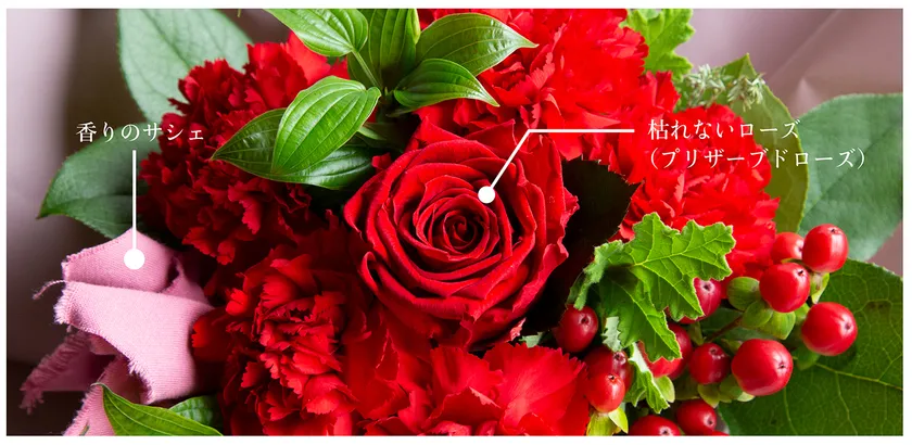 生花の中に1輪、枯れないローズ(大輪のプリザーブドローズ)を忍ばせています。花束を楽しんだ後は、枯れないローズを「香りのサシェ」に着せ替えます。可愛らしいローズサシェとして、香りとともに、母の日の余韻を長くお楽しみいただける趣向です。