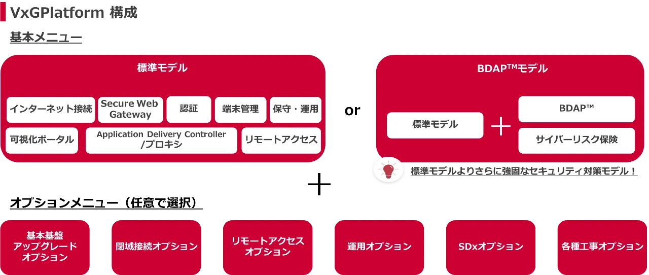 本ソリューションはセキュリティ機器の導入から保守運用までを一元的にご提供するセキュリティプラットフォームです。基本メニューは標準モデルとBDAP(TM)(※3)モデルの2種類から選択でき、さらにオプションで必要な機能を組み合わせてご利用いただけます。主な特長は以下の通りです。