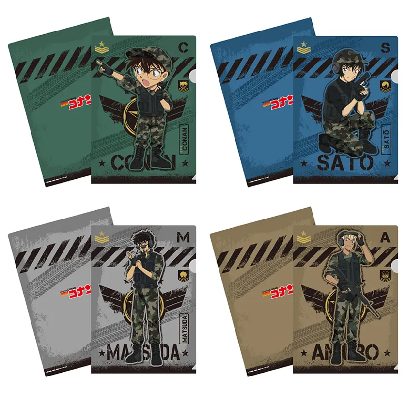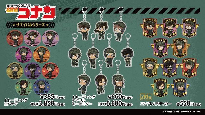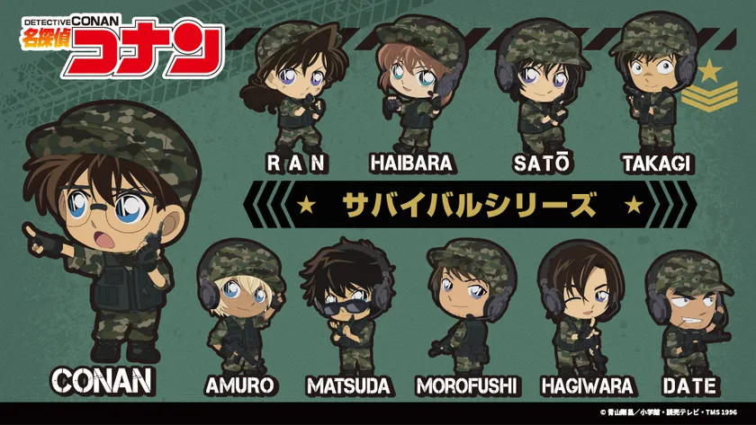 迷彩服を着用した姿がかっこいい!新規描き下ろしイラスト「サバイバルシリーズ」新商品が登場!江戸川コナン、佐藤美和子、安室透、松田陣平の4キャラがラインナップ!さらにデフォルメシリーズも同時展開!