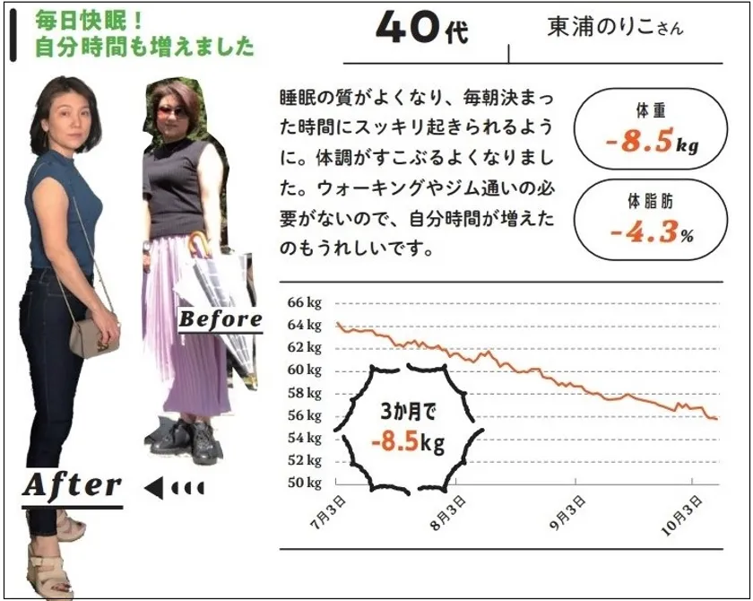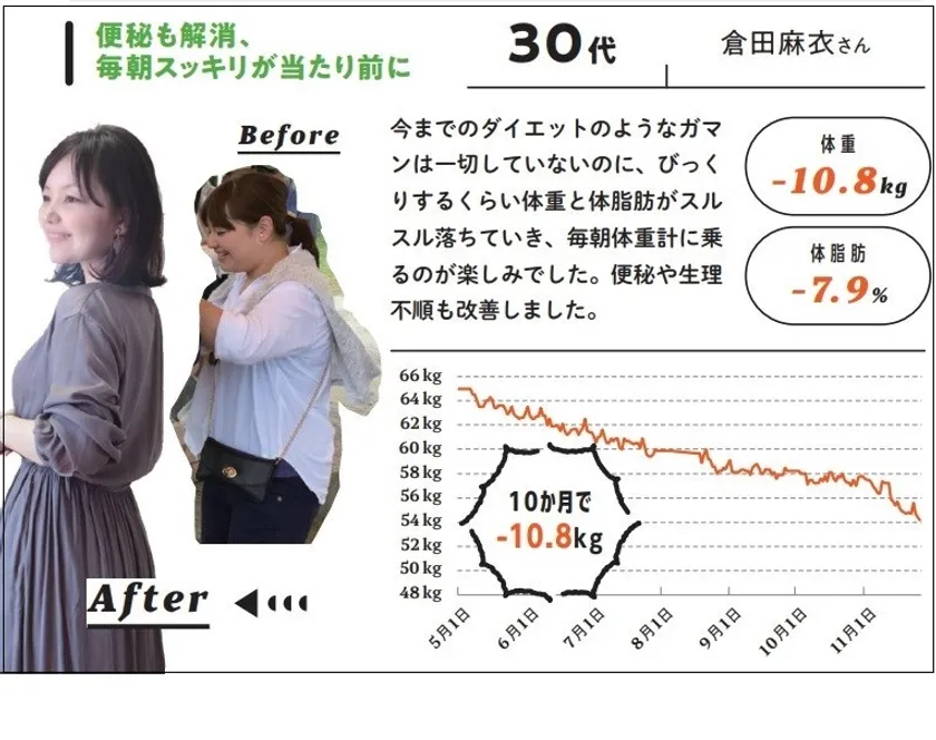 転機は、20代後半で保健師に転身したことでした。栄養学を学び、糖尿病患者などの食事指導をする中で、「ちゃんと食べればやせるんだ!」と悟ったそう。実際に1年でスルスルと12kgもやせて、一児のママになった今もキープしています。