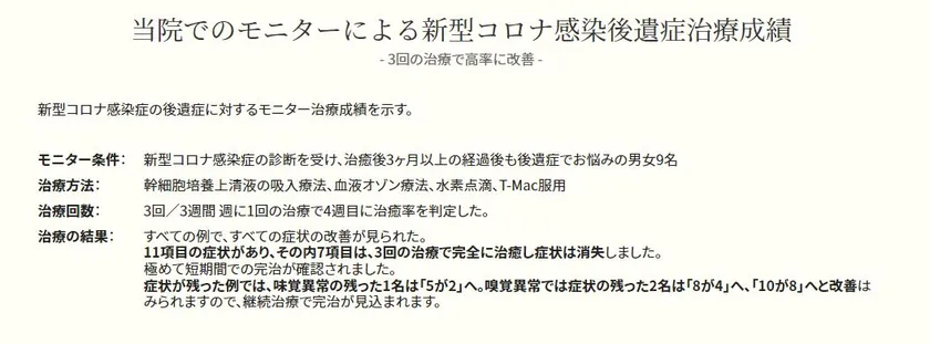 そんな中で「東京予防医療クリニック」では、病理学を専門にしていた森先生がコロナ後遺症について考察したとき、当院の独自の治療法を応用できないか?というのが始まりで、モニターさんによる3回の治療結果で高率に改善が見られ、そこで、コロナ後遺症治療外来を設置し治療プログラムを開始することになりました。