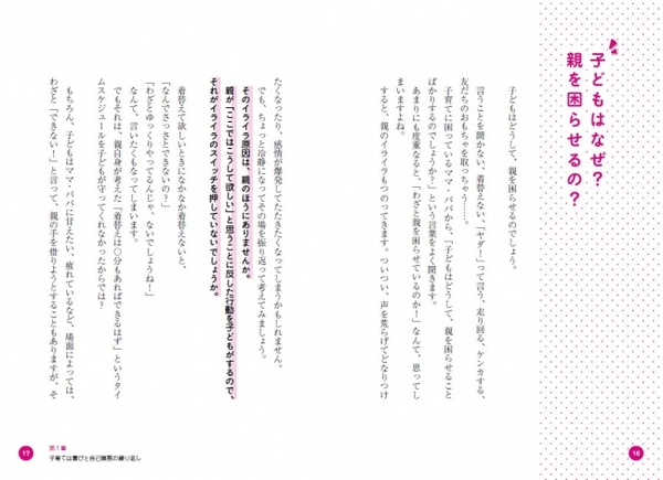 本書では、イライラしてどなってしまいそうなとき、たたいしてしまいそうなときに、どうしたら感情的にならなずにいられるのか。また、しつけの範囲や仕方なども具体的にお伝えしています。