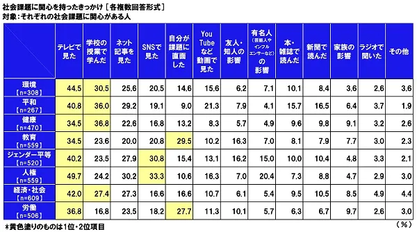 環境、平和、健康、経済・社会では「学校の授業」、ジェンダー平等、人権では「SNS」「ネット記事」の影響力も