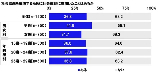 まず、全回答者(1,500名)に、社会課題を解決するために、社会運動に参加したことはあるか聞いたところ、「ある」は36.8%、「ない」は63.2%となりました。