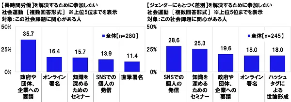 全36項目のうち、社会人Z世代と学生Z世代の関心の高さが1位であった、長時間労働とジェンダーにもとづく差別についてみると、長時間労働では1位「政府や団体、企業への要請」(35.7%)、2位「オンライン署名」(16.4%)、ジェンダーに基づく差別では1位「SNSでの個人の発信」(28.6%)、2位「知識を深めるためのセミナー」(25.3%)でした。