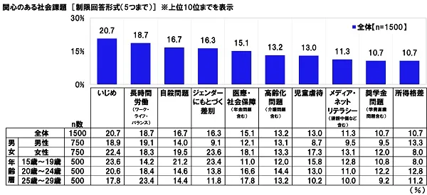 すべての項目をまとめてみると、「いじめ」(20.7%)が最も高くなり、「長時間労働(ワーク・ライフ・バランス)」(18.7%)、「自殺問題」(16.7%)、「ジェンダーにもとづく差別」(16.3%)、「医療・社会保障(年金問題含む)」(15.1%)が続きました。