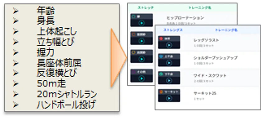 年齢・身長・体力測定結果にあわせて500種類のトレーニング動画から最適なトレーニングメニューを処方!