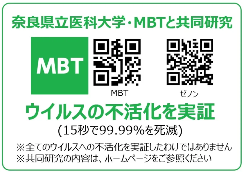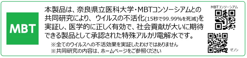株式会社ゼノン(本社:東京都中野区/代表取締役社長:阿部 昭典)は、2021年4月、公立大学法人奈良県立医科大学及び一般社団法人MBTコンソーシアムとの共同研究において、「ZENON 特殊アルカリ電解水」が、新型コロナウイルス(SARS-CoV-2)の不活効果<※>を実証したことを受け、上記団体から、医学的に正しく、社会貢献が大きく期待される製品として、MBTロゴマークの製品への使用が2022年1月許諾されました。同社では、サスティナブルな社会への貢献を目指す上で、<独自技術で生成した特殊アルカリ電解水のポテンシャル>を、共通の理念を持つMBTコンソーシアムの会員企業などに積極的に情報発信し、産官学や産産における共同開発や製品化を図り、国内外の企業や家庭における「新たなソリューション」として提供していきたいと考えています。