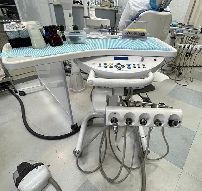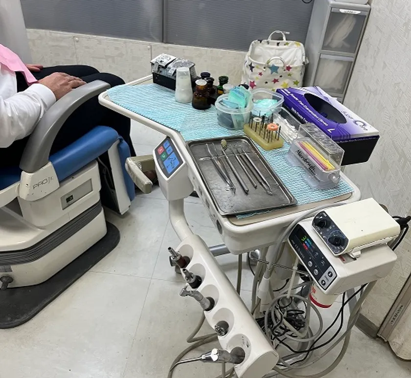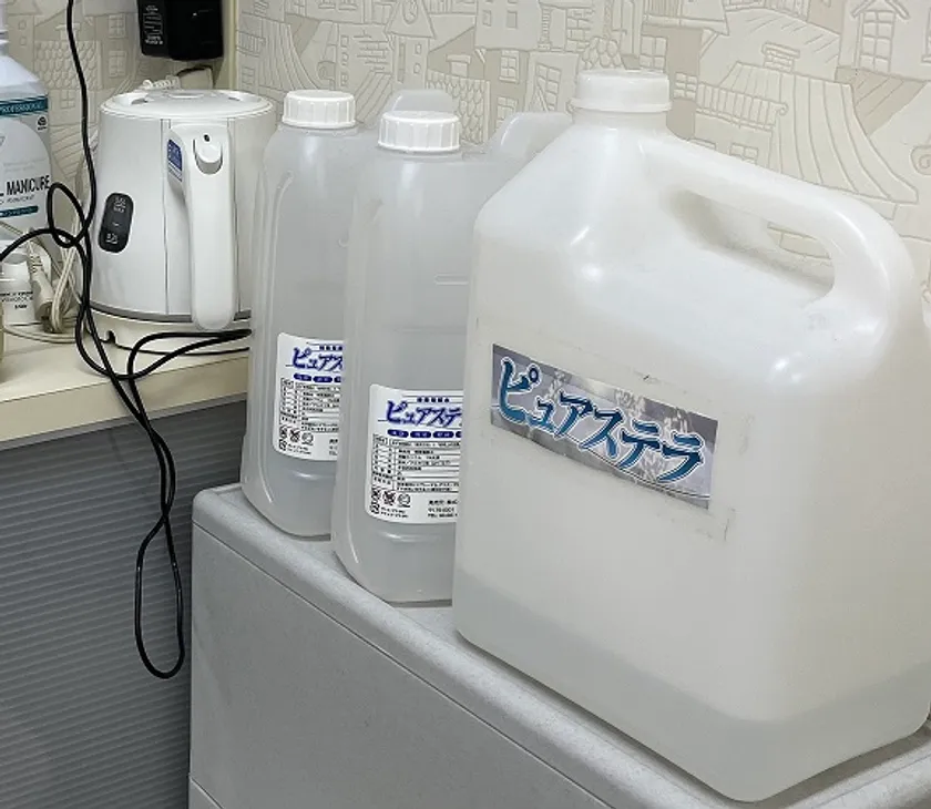 ・他の歯科医院同様に、当クリニックでも様々な歯科医療器具や用品があります。治療用のチェアユニットやワークテーブルをはじめ、待合室のイスやテーブルなど日頃の除菌清掃用としての使用の他、どうしても汚水を含めた水滴が飛び散る場所にある金属製のステンレストレーなどの用品や器具、スチールバーなどの材料の滅菌や洗浄などにも、アルカリ性の特徴である「錆の心配がない」ので使用しています。また、消毒や滅菌のために毎日使用している「オートクレーブ(高圧蒸気滅菌器)」では、熱に弱いために使用できないプラスチック製の器具や用品の一次洗浄剤として使用している他、タンパク汚れをキレイに落とすために、「超音波洗浄器」の洗浄液としても活用しています。器具の中には、アルミ製のモノもあるので、使用箇所には多少の注意が必要ですが、泡なしで二度拭きの手間がないのも、歯科衛生士・歯科助手は重宝しているようです。