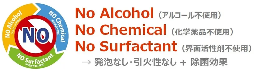 水のため、引火による火災リスクや輸出制限を気にすることなく使うことができます。また、一般的な洗剤で発生する「泡」がでないため、「すすぎの面倒や二度拭き」の必要がありません。
